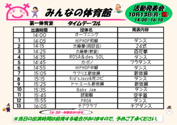 10月13日(月・祝)みんなの体育館『活動発表会』のお知らせ